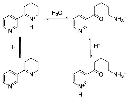 Anabaseine equilibrium states. Lower pH shifts the equilibrium towards the hydrolyzed product, whereas the cyclic anabaseine is favoured by higher pH. Adapted from [45].