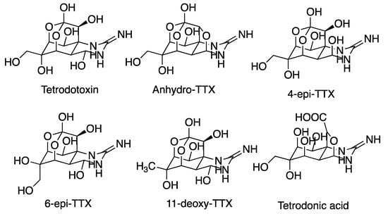 - Hwang, D.F.; Noguchi, T. Tetrodotoxin Poisoning. In Advances in Food and Nutrition Research; Steve, L.T., Ed.; Academic Press: Amsterdam, The Netherlands, 2007; Volume 52, pp. 141–236. [Google Scholar]