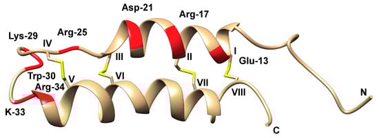 B-IV NMR structure (RCSB id: 1VIB) [99] with residues important for activity marked in red, Cys residues in roman numerals, and disulfide bonds in yellow.