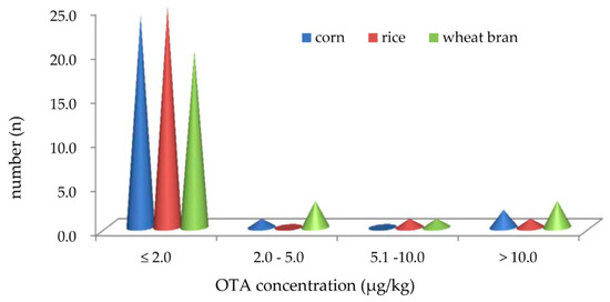 All the concentrations of OTA at different time intervals on different substrates were obtained using the software OpenLAB CDS A.02.01 (Santa Clara, CA, USA). Parameters such as the frequency, the mean, and the range of OTA for strains of A.niger used in this study were obtained by applying the SPSS statistical package (version 20.0, IBM, Amund, NY, USA). The analysis of variance (ANOVA) was employed for statistical analysis by comparing the concentrations of OTA on different substrates and time intervals.