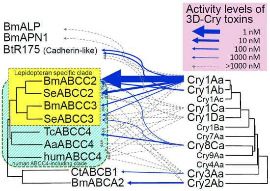 Cry1 and Cry2 are located at the most distant sides of the 3D-Cry toxin phylogenetic tree (Figure 1), whereas Cry3 is located in the middle. Therefore, 3D-Cry toxins may have adapted to use ABCA, ABCB, and ABCC during evolution. ABCB is closest to ABCC and ABCA is most distant from ABCC [57], and ABCD, ABCE, ABCF, ABCG, and ABCH are between ABCA and ABCC. Therefore, it is no wonder that functional receptors of the other 3D-Cry toxins will be found from these ABC transporters.
