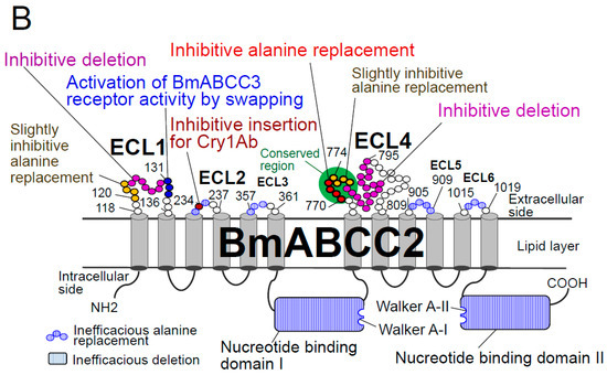 The extracellular loop (ECL) 1 and 4 domains of BmABCC2 were found to be related to its Cry1Aa receptor activity in deletion mutants generated using a baculovirus-Sf9 heterologous expression system (Figure 2), and the importance of ECL4 was confirmed using alanine-replacement mutants [24]. Recently, we further confirmed the importance of ECL1 using alanine-replacement mutants (in preparation). However, alanine replacement in ECL2, ECL3, ECL5, and ECL6 did not affect the receptor activity of BmABCC2 [24,54]. Thus, ECL1 and ECL4, the longest loops in BmABCC2, look important for its interaction with Cry1Aa (Figure 2).