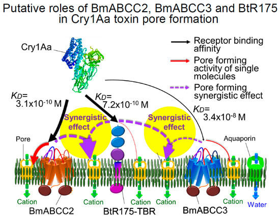Putative roles of BmABCC2, BmABCC3, and BtR175 in Cry1Aa pore formation. Arrow thickness represents Cry1Aa receptor interaction and pore formation activities [30,31,42,50].