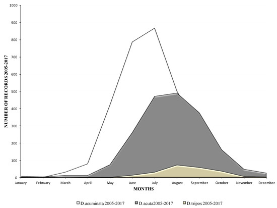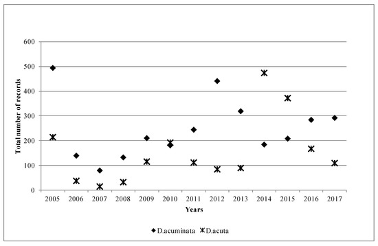 To make this comparison, we first calculated the total number of samples per site by multiplying the average number of samples per year by the total number of years. The sum of all the samples collected over this period in the southern region sites was 1500, the lowest number in all the regions. The rule of three was used to calculate the total number of observations of D. acuminata and D. acuta in each region by multiplying 1500 by the total number of observations and dividing by the total number of samples for that region. Then, the ratio between the species was calculated using these values.