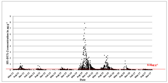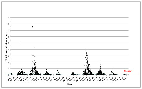 Dinophysistoxins-2 (DTX-2) quantifiable concentrations in µg∙g−1 found in shellfish between 2009 and 2017. The red line equals the closure level for diarrheic shellfish poisoning (DSP) toxin equivalents 0.16 µg∙g−1.