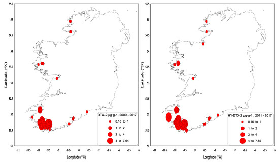The records were reviewed to observe the seasonal occurrence and geographic distribution of the individual DSP isomers. All the toxin concentrations are expressed as µg∙g−1, and only quantifiable concentrations have been plotted in our figures. Any samples assigned values of <limit of detection or <limit of quantification have not been included in this review.