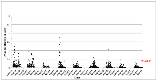 Hydrolysed okadaic acid quantifiable concentrations in µg∙g−1 found in shellfish in 2011–2017. The red line equals the closure level for DSP toxin equivalents 0.16 µg∙g−1.