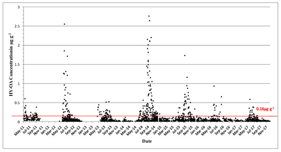 OA and hydrolysed OA values above the regulatory limit by geographical area in 2009–2017.