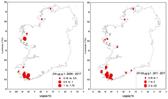 OA is found predominantly in blue mussels, where quantifiable concentrations were usually observed from May onwards and had generally increased to above the regulatory levels by June (Figure 6). These concentrations usually decreased below the regulatory levels by October–November, and the toxin was normally absent from the shellfish samples by the end of the year. The highest OA concentrations above the regulatory levels were observed in blue mussels (1.74 µg∙g−1 in June 2012) and in the remainder tissues of king scallops, 0.28 µg∙g−1 (Table 3). OA acyl derivatives were also present in shellfish (Figure 7) and followed the same concentration and seasonality patterns as the parent compound; however, acyl derivatives tended to stay longer in shellfish tissues during years of high toxicity. OA and its acyl derivative were predominant in the southwestern coast of Ireland (Figure 8).