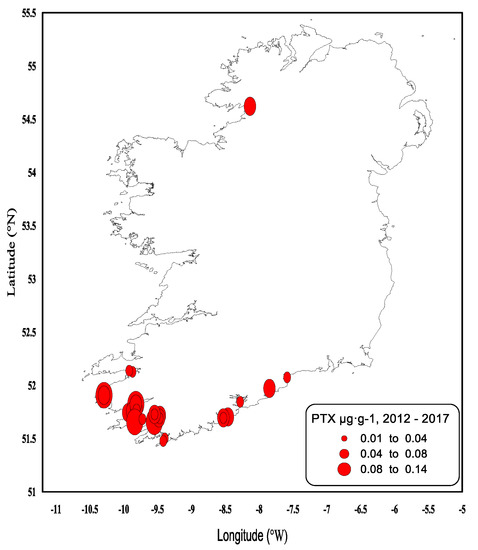 Quantifiable Pectenotoxin (PTX Equivalents) concentrations in shellfish in 2012–2017.