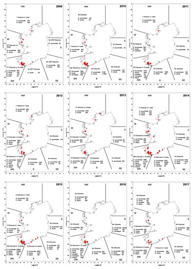 Maps of closures for harvesting per region during the period of 2009–2017 (Figure 10) suggest that the largest number of closures due to DSP incidents occurred in the southwest. In particular, the periods of 2009–2010 and 2014–2015 were exceptionally difficult, with protracted closures and high toxicity. These periods were related to the relative dominance of D. acuta in the water column, except for 2009, when more D. acuminata observations were made. The toxicity in these two periods showed toxic ‘overwintering’ (Table 4), especially in 2015 with 56 closures in January, 16 in February and 3 in March. During this time, there were no closures in the eastern and southeastern regions, and a small number of closures in the south, west and northwest. Figure 11 shows the total number of harvesting closures and the highest toxin OA equivalent recorded per year. As can be observed, 2014 and 2015 have been the worst two consecutive years for DSP toxins in Ireland since 2009 and 2010.