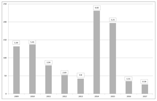Quantifiable okadaic acid concentrations in µg∙g−1 found in shellfish in 2009–2017. The red line equals the closure level for DSP toxin equivalents 0.16 µg∙g−1.
