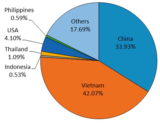 In Taiwan, border inspection techniques include visual inspection, hygiene-quality examination, and document verification. From 2011 to 2017, the top six countries of origin for peanuts and peanut products by weight were Vietnam (42.07%), China (33.93%), the United States (4.10%), Thailand (1.09%), Philippines (0.59%), and Indonesia (0.53%) shown in Figure 1. Because the food mass of imported peanuts and peanut products consumed (kg/year) from these countries differs, the import-to-production factors of this study were included. For example, if 10% of peanuts and peanut product are imported, an import-to-production factor of 0.1 is derived.