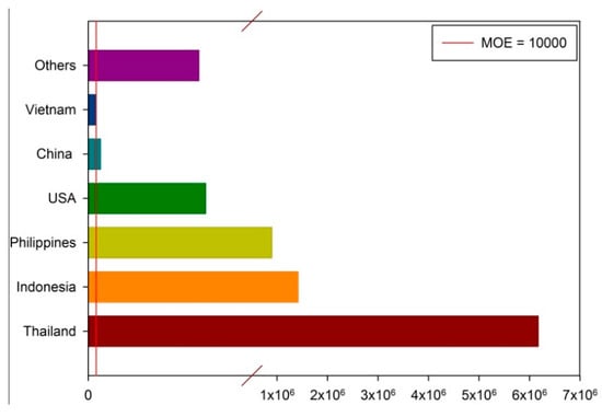 Figure 2 shows the estimated exposure (whole group) of Taiwanese people (all ages) to aflatoxins in peanuts and peanut products from various countries. The aflatoxins MOE levels in peanuts and peanut products from China, Indonesia, Thailand, the United States, and the Philippines were above the safe lower limit of 10,000, indicating that for the majority of the population, there is no public health or safety risk posed by the consumption of imported peanuts and peanut products. However, the results indicate that consuming products imported from Vietnam may pose potential health concerns. This suggests that regulatory actions must be continued, which includes educating consumers about processed foods with relatively high contamination to avoid excessive exposure.