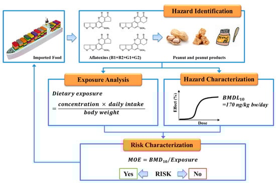 The consumption and occurrence data is an important component of risk assessment. Figure 4 shows the aflatoxins hazard exposure estimates flowchart in this study. Dietary exposure to aflatoxins from peanuts and peanut products can be calculated using the following equation: