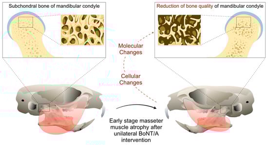 Most of the studies that use rodents as models to evaluate the effects of BoNT/A-induced masticatory imbalance are highly focused on the mandibular condylar cartilage (MCC). This is important to highlight, because early effects of masseter muscle atrophy after BoNT/A intervention seem to be related to cellular/molecular and microstructural changes in the subchondral bone, preceding detectable damage of the MCC. Therefore, mouse models are important to understand the potential adverse effects of BoNT/A in the homeostasis of mandibular, as well as to unveil the cellular and molecular mechanisms responsible for these outcomes. Taken together, results from pre-clinical models using BoNT/A intervention could also shed light on understanding pathologies such as temporomandibular joint osteoarthritis, where changes in the remodeling process of subchondral bone have been suggested as an early manifestation of the disease [82].