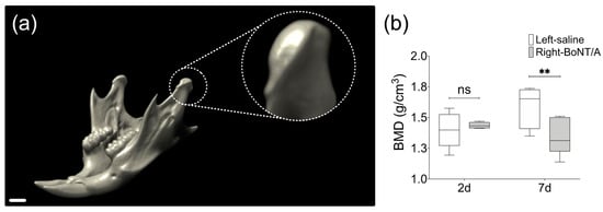 Tsai et al. (2010) found no differences in BMD from the whole mandible samples in a rat model of unilateral injection of BoNT/A in the masseter muscle, three months after intervention [72]. However, a 3–4% reduction in BMD was described in mandibular condyles of unilateral BoNT/A-injected young female mice four weeks after intervention, comparing the injected side with the contralateral non-injected side or with samples from animals without intervention [63,66]. Unpublished results from our mouse model (Figure 2) show even earlier changes in BMD [74] (Figure 3). In adult mice, seven days after unilateral BoNT/A intervention in the masseter muscle, a significant reduction in the BMD of the mandibular condyles from the BoNT/A-injected side, compared to the saline-injected side was found (Figure 3).