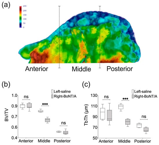 In comparison with 2D evaluations, the 3D (volumetric) analyses of mandibles using microCT technology offers a more complete picture of how bone loss presents following BoNT/A intervention. It has been demonstrated for example that the extent of bone loss is less than expected from 2D analyses, albeit still significant. An advanced 3D analysis using high resolution microCT showed a reduction of 10–11% in bone volume fraction (BV/TV) in the mandibular condyle of young adult female mice [63] and adult male mice [62] four weeks and two weeks after, respectively. A higher value was reported in another study (loss of 21% in BV/TV), but these mice were younger (five weeks old) [66]. In mandibular condyles of adult male mice, Tb.Th was also significantly reduced, while trabecular number (Tb.N) and trabecular density (Conn.D) were significantly increased at two weeks. However, no statistically difference was detected for these bone parameters in the alveolar bone at the first molar level [62]. On the other hand, in the mandibular condyles of young adult female mice, Tb.Th was significant reduced (17%) and trabecular separation (Tb.Sp) was increased by 18% at four weeks, compared with control side [66]. Moreover, unpublished results from our lab using a high resolution microCT approach previously described [62] has confirmed that the significant reduction of the bone microstructure parameters such as BV/TV and Tb.Th is more pronounced in the middle portion of the mandibular condyle [74] (Figure 4). This may explain why findings of studies that only assessed the middle portion of the mandibular condyle using a 2D approach reported higher bone loss than those using 3D evaluation. Interestingly, bilateral injection of BoNT/A in the masseter muscles may have a greater adverse effect on mandibular condyle microstructure. As shown by Shi et al. in adult female rats, at 4 weeks, BV/TV and Tb.Th of the mandibular condyles were both decreased by a 50% and the Tb.Sp was significantly increased when compared with samples from control individuals [64].