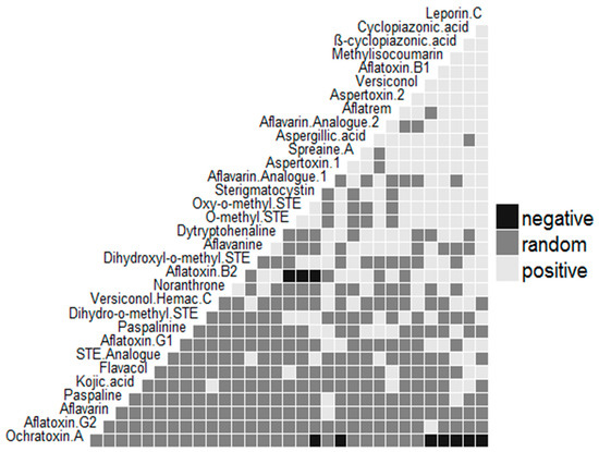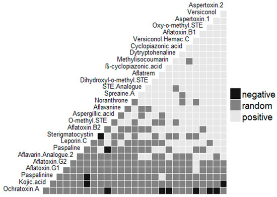 Co-occurrence matrix of metabolites of Aspergillus species recovered from fermented foods from Nigeria. A positive association illustrates that with the occurrence of a particular metabolite, its most likely that the other metabolite will be present. A negative association illustrate that with the occurrence of a particular metabolite, it is most likely that the other metabolite will not occur. A random association illustrates that nothing can be said about the co-occurring metabolites.