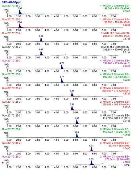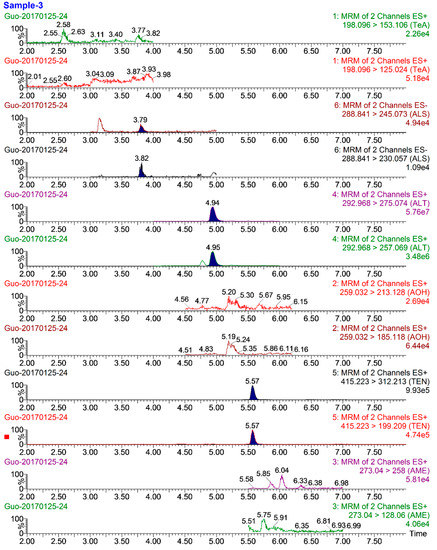 The validated method was applied to detect six Alternaria toxins in 56 grape samples randomly collected from the different markets and vineyards in Shanghai. MRM chromatograms of a typically contaminated grape sample are shown in Figure 4. The occurrences and concentration levels of the six Alternaria toxins are summarized in Table 4.