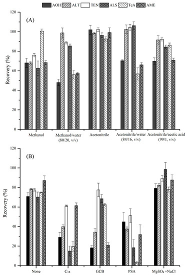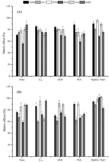 For sample clean-up, a modified QuEChERS method was developed to enrich the targeted analytes, and to remove the co-extractives as completely as possible. Different materials, including graphitized carbon black (GCB) (0.5 g), primary secondary amine (PSA) (0.5 g), C18 (0.5 g), MgSO4 (0.5 g), and NaCl (0.5 g) were tested for their purification efficiency. Unsatisfactory recoveries of 18.2–77.5% and 3.4–51.2% were obtained (Figure 2B) by using GCB and PSA, respectively, which had been used frequently to remove chlorophylls from fruits and vegetables in the previous studies [21]. The poor purification effects in the current work might be because of the π–π interactions through the sp2 hybrid orbitals of GCB and the planar aromatic compounds (i.e., AOH, AME, and ALT), as well as the ionic affinity between the amines in PSA and the carboxyl group in ALS [22,23,24]. With regard to C18, this material showed poor recoveries in the range of 15.0–61.5%. Finally, the salting-out step with anhydrous MgSO4 and NaCl was employed with the highest recoveries. in the range of 77.9–98.5% (Figure 2B), and lowest matrix effects, in the range of 82.8–102.3% (Figure 3).