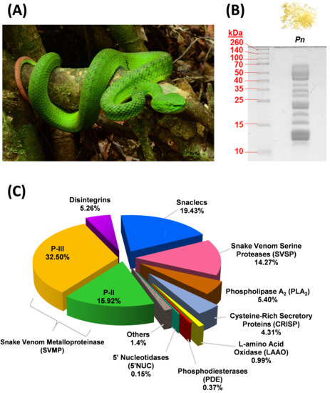 Venomics of Trimeresurus (Popeia) nebularis from Malaysia. (A) An adult T. nebularis perching on a tree branch. Both sexes of this species are “inornata” meaning “unadorned,” lacking ventrolateral stripes. (B) 15% SDS-PAGE of T. nebularis venom (10 µg) under reducing conditions. Upper panel: lyophilized venom powder with yellow coloration. (C) Proteome of T. nebularis venom, percentages indicate the relative abundances (% by total venom proteins) of protein family.