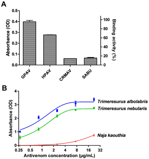 In antivenom immunoreactivity study, our preliminary findings revealed that GPVAV exhibited the highest cross-reactivity (followed by Hemato Polyvalent Antivenom, HPAV) toward T. nebularis venom antigens, exceeding the immunoreactivities shown by Calloselasma rhodostoma Monovalent Antivenom (CRMAV, the Malayan pit viper antivenom) and Serum Anti Bisa Ular (SABU, the Indonesian trivalent antivenom) by at least 4 folds (Figure 2A). GPVAV showed a dose-dependent increase in immunological binding activity to T. nebularis venom, with the median effective concentration, EC50 determined as 1.2 µg/mL. The binding potency of GPVAV to T. nebularis venom was slightly lower than binding to the homologous Thai T. albolabris venom (EC50 = 0.7 µg/mL). The ability of GPVAV to cross-react with T. nebularis venom proteins indicates that common protein antigenicity is shared between the venoms of T. albolaris (species from which GPVAV was raised against) and T. nebularis. By the current systematics both species were divided into two different subgenera: Trimeresurus subgenus for T. albolabris and Popeia subgenus for T. nebularis [2]. The finding supports that the venom protein antigenicity is well conserved between the two different subgenera of Trimeresurus species, despite their morphological and ecological differences in particular related to habitat and geographical distribution [7,8,17]. On the other hand, Trimeresurus sp. are more distantly separated from C. rhodostoma in the phylogenetics of Asian pit vipers [50], hence the more variable venom antigenicity and a much lower cross-reactivity level of CRMAV and SABU which were raised against C. rhodostoma venom.
