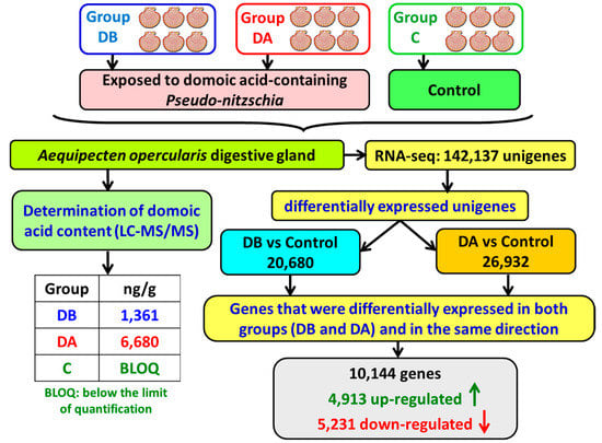 Scheme of the differential expression results obtained in A. opercularis digestive glands after exposure to domoic acid-producing Pseudo-nitzschia.