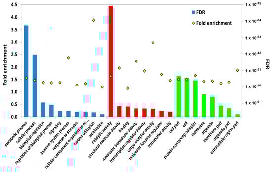 Level-2 enriched gene ontology (GO) terms for the differentially expressed genes in the biological process (BP, blue), molecular function (MF, red), and cellular component (CC, green) categories. FDR: p-value adjusted by FDR. Histograms represent the FDR-adjusted p-value, and the yellow diamonds represent the fold enrichment.