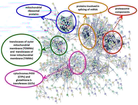 Protein–protein interactions can be employed to group and organize all the protein-coding genes in a genome [37]. From the 4913 up-regulated genes, a Blastx search found 931 human homologs in the STRING database. The network obtained in the highest confidence (0.9) mode is enriched in interactions (p-value <1 × 10−16). The results obtained with the up-regulated DEGs showed a small number of highly connected protein nodes. Each group of proteins is involved in specific biological processes (Figure 3; Figure S1; File S6): degradation of proteins (proteasome components), synthesis of mitochondrial proteins (mitochondrial ribosomal proteins), translocation of cytosolically synthesized mitochondrial preproteins (translocases of outer and inner mitochondrial membrane, TOMMs, and TIMMs), splicing of mRNA (spliceosome components), and phase I and phase II metabolism of xenobiotics (cytochromes P450 and glutathione S-transferases).