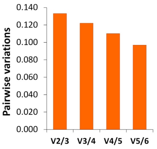 The candidate reference genes (EIF4EBP2, RPS4, VAMP7, RAP1B, DNAJ, and MYH9) (Table 9) were selected for their stable expression based on the RNA-seq data. NormFinder stability values ranged from 0.137 to 0.237 and the geNorm average M from 0.339 to 0.584 (Table 10). The standard deviations (SD) of Cq values calculated with BestKeeper were low (0.53–0.69, Table 10). Pairwise variation (Vn/n+1) [38] was used to determine the optimal number of reference genes for normalization. Figure 4 shows that V5/6 attained the minimum pairwise variation value (0.097); therefore, five reference genes were used for normalization [39]: EIF4EBP2, RPS4, VAMP7, RAP1B, and DNAJ. The least stable reference gene candidate was MYH9.