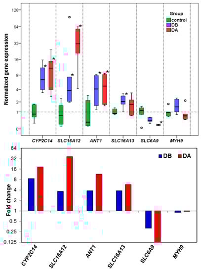 The normalized gene expression of the five target genes, and the non-selected reference gene (MYH9) is displayed in Figure 5. There was good agreement between RT-qPCR (Figure 5, upper panel) and RNA-seq (Figure 5, lower panel). The RNA-seq results showed that CYP2C14, SLC16A12, ANT1, and SLC16A13 were up-regulated in groups DB and DA in relation to the control; these genes were also up-regulated when the RT-qPCR data were analyzed. The SLC6A9 gene was down-regulated in groups DB and DA in relation to the control group (Figure 5, lower panel), but the RT-qPCR data showed significant differences only between group DA and the control. The candidate reference gene MYH9 is not differentially expressed.