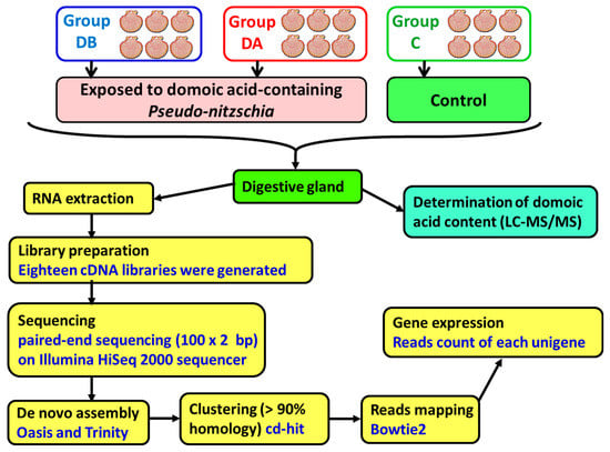 A total of 18 cDNA libraries were generated (Figure 6) from the digestive gland of the scallops (6 obtained from each group: DB, DA, and control). The poly(A) + mRNA fraction was isolated from total RNA, and cDNA libraries were obtained following Illumina’s recommendations. Briefly, poly(A) + RNA was isolated on poly-T oligoattached magnetic beads and chemically fragmented prior to reverse transcription and cDNA generation. The cDNA fragments then went through an end repair process, the addition of a single ‘A’ base to the 3’ end, and afterwards, the ligation of the adapters. Finally, the products were purified and enriched with PCR to create the indexed final double-stranded cDNA library. The quality of the libraries was analyzed using a Bioanalyzer 2100 high sensitivity assay; the quantity of the libraries was determined by real-time PCR in a LightCycler 480 (Roche Diagnostics, Mannheim, Germany). Prior to cluster generation in cbot (Illumina), an equimolar pooling of the libraries was performed. The pool of the cDNA libraries was sequenced by paired-end sequencing (100 × 2 bp) on an Illumina HiSeq 2000 sequencer (Illumina, San Diego, CA, USA).