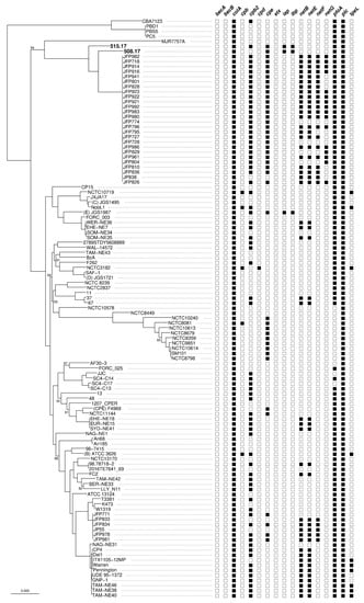 Maximum likelihood phylogenetic tree of C. perfringens based on their core genome and presence/absence pattern of 17 toxin genes. Each branch support was assessed by the ultrafast bootstrap approach (only support values <95% are shown). The scale bar represents 0.005 substitutions per nucleotide. The presence/absence of each of the 17 toxin genes is indicated by a black/white square for each of the 115 analyzed genomes. becAB: binary enterotoxin of C. perfringens; colA: collagenase A; cpb: C. perfringens beta toxin; cpb2, cpd: C. perfringens delta toxins; cpe: C. perfringens enterotoxin; etx: C. perfringens epsilon toxin; iap, ibp: C. perfringens iota toxin; netBEFG: necrotic enteritis toxins; pfoA: perfringolysin; plc: C. perfringens alpha toxin; tpeL: toxin perfringens large cytotoxin.