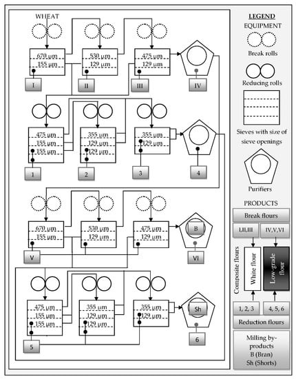 After cleaning of 10 kg of each wheat sample by a Laboratory Grain Cleaner 5150 (Huddinge, Sweden), a portion of 3 kg was milled using a Bühler MLU 202 (Bühler, Uzwil, Switzerland) pilot scale mill. The wheat preparation for milling included wheat grain tempering (to ensure differences in the structural characteristics between the anatomic parts of the wheat kernel) to 13.5% of moisture with a holding period of 24 h. This was followed by the second tempering up to the moisture content in wheat grain of 15% with an additional holding period of 30 min. Milling was carried out according to an extended scheme, presented in Figure 1. Milling of wheat grains is a gradual reduction process consisting of sequential and consecutive size reduction (roller mills) and separation (plansifters). The process involves breaking open the kernel, scraping the endosperm from the bran (break rolls made corrugated cast steel) and gradually reducing the chunks of endosperm into flour by smooth reducing rolls. Segregation between the kernel parts occurs in plansifters (using sieves with different sieve openings), where sieves separate particles of different size and in purifiers, where sieves and air-flow separate particles of different size, specific gravity and shape. Generally, in the milling process through consequent milling and sieving operations numerous flour fractions, originating dominantly from different part of wheat kernel, are obtained and subsequently mixed in order to obtain composite flours of desired quality and composition. According to presented milling diagram (Figure 1) from each wheat sample 12 milling stream flours (6 break flours (I–VI) and 6 reduction flours (1–6)) and milling by-products (shorts and bran) were obtained.