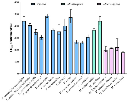 The following are available online at https://www.mdpi.com/2072-6651/11/3/149/s1, Figure S1: Comparison of the median lethal dose values (LD50) of the venoms used in the present study determined by intravenous injection in in mice.