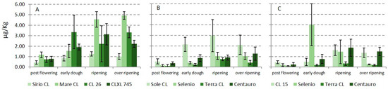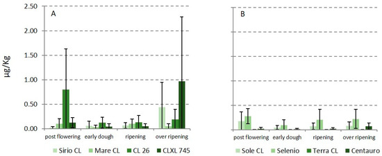 In terms of AFs, aflatoxin B1 (AFB1) was detected in few samples (Figure 2), mainly at ripening (highest level was 2.46 µg kg−1), always lower than the limit of 5 µg kg−1 fixed by the European Union (EU) for rice and maize subjected to sorting or other physical treatment before human consumption [10]; further, results for the replicates varied greatly, showing a high standard deviation and a not-uniform contamination.