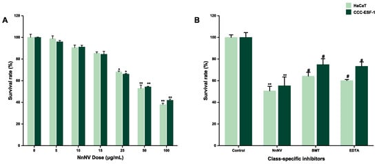 Cell viability was determined using the MTT assay. The MTT assay is a method for detecting cell survival and growth. The detection principle is that succinate dehydrogenase in living cell mitochondria can reduce exogenous MTT to water-insoluble blue-purple crystalline formazan and deposit in cells, while dead cells do not have this function. The two kinds of cells were plated in 96-well culture plates at a density of 1 × 106 cells/mL. Three duplicates were set up for each set of experiments. After incubation for 24 h, cell groups were treated with NnNV (5, 10, 15, 25, 50 and 100 μg/mL) and NnNV-I for 24 h, respectively. Since there is no study on the skin toxicity of BMT and EDTA to jellyfish venom, based on the studies of the effects of BMT and EDTA on the hemolytic activity of NnNV [16], the approximate concentration of the two inhibitors were obtained, and preliminary experiments were carried out to determine the final concentration of BMT and EDTA (Figure S1). Venom solutions were incubated for 30 min with BMT to investigate the effect of BMT on the pathological effects induced by B. asper venom [15], and the effect of hemolytic activity of NnNV was determined after the reaction of NnNV with BMT or EDTA for 30 min [16]. Hence, NnNV was reacted with BMT or EDTA for 30 min in follow-up experiments. BMT (0.5 μM, final concentration) or EDTA (20 μM, final concentration) were pretreated with NnNV (50 μg/mL, final concentration) for 30 min [15,16], and these mixtures were named as NnNV-I.