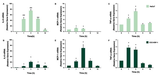 Effect of NnNV on the gene expression of IL-6, MCP-1, and TNF-α in HaCaT and CCC-ESF-1 cells at different times. (A–C) HaCaT and (D–F) CCC-ESF-1 were treated with 10 μg/mL NnNV for various times (0, 1, 3, 6, and 12 h). * p < 0.05, ** p < 0.005, and *** p < 0.001 vs. Control.
