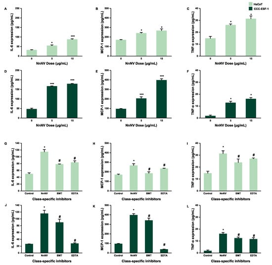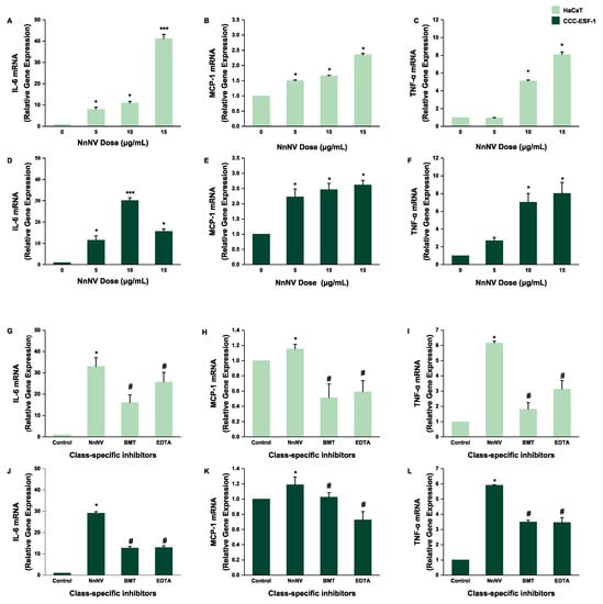 Effect of NnNV and NnNV-I on the gene expression of IL-6, MCP-1 and TNF-α in HaCaT and CCC-ESF-1 cells. (A–C) HaCaT and (D–F) CCC-ESF-1 were treated with various concentrations of NnNV for 24 h. (G–I) HaCaT and (J–L) CCC-ESF-1 were treated with various NnNV-I for 24 h. * p < 0.05, ** p < 0.005 and *** p < 0.001 vs. Control (to verify that NnNV can promote mRNA expression of the inflammatory factors in cells), # p < 0.05, ## p < 0.005 and ### p < 0.001 vs. NnNV (to verify that MMP inhibitors can reduce mRNA expression of the inflammatory factors of NnNV in cells).