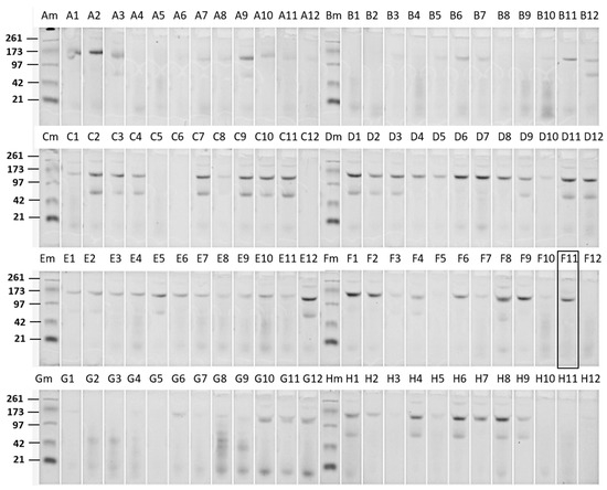 An example of SDS-PAGE analysis of Cry proteins isolated from Bt strains arrayed in one seed culture plate, DP7. In this plate of screening 96 Bt strains, one strain, F11 (boxed), was found to be active against WCRW. For the analysis, E-PAGE™ Precast Gel System from Life Technologies was used. E-PAGE has 96 sample lanes and eight marker lanes (Am–Hm), in which, E-PAGE™ SeeBlue® Protein Standard was loaded. The molecular weights of the standards are shown on Row A, C, E, and G. The gel was stained with Coomassie Blue. Digital image of the stained gel was aligned by rows utilizing Life Technologies’ E-Editor™ Software.