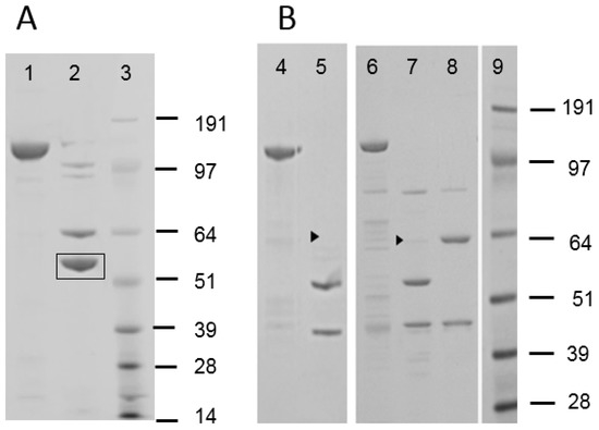SDS-PAGE analysis of the Cry8Hb protein (protoxin) isolated from DP7-F11 (Panel A) and MBP fusions of Cry8Hb and IP3 toxins (toxin part only) (Panel B). Panel A, Lane 1, 135 kDa Cry8Hb from DP7-F11; Lane 2, trypsin-digested 65 kDa and 55 kDa fragments of the DP7-F11 protein. Panel B, Lane 4, MBP-Cry8Hb(toxin); Lane 5, trypsin-digested MBP-Cry8Hb; Lane 6, MBP-IP3-1; Lane 7, trypsin-digested MPB-IP3-1; Lane 8, trypsin-digested MBP-IP3-7. Very faint bands at 65 kDa (arrowheads) were visible in Lane 5 (Cry8Hb) and Lane 7 (IP3-1) but not reproduced clearly in the photograph. Lanes 3 and 9 were SeeBlue® Plus-2 protein standard with approximate molecular weights in kDa. The stained SDS-PAGE gel, Panel A, Lane 2, was blotted on a sheet of PVDF membrane, and the 55 kDa band (boxed) was excised for N-terminal sequencing at Stanford University Protein and Nucleic Acid Facility.