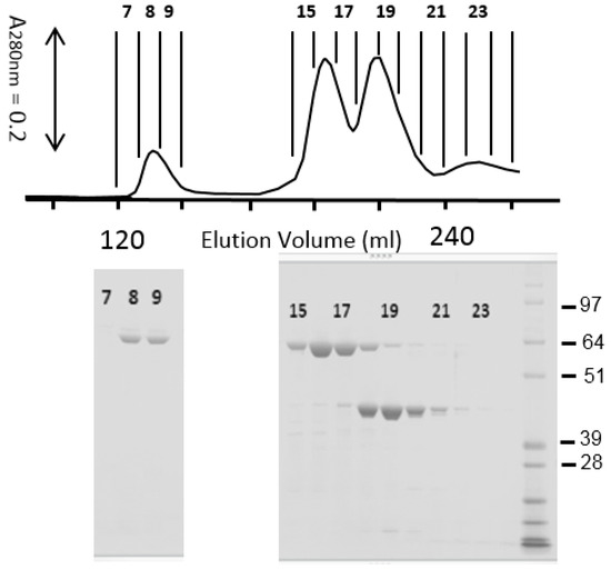 Superdex 200 column chromatography of trypsin-digested MBP-IP3-7 showing most of 65 kDa, MBP-free IP3-7 molecules were monomeric eluting at approx. 195 mL elution volume (Fraction 16) from this GE 26/70 XK preparative column. The 44 kDa MBP appeared at approx. 215 mL elution volume (Fractions 18–19). For this example, 5 mL of 2 mg/mL MBP-P3-7 were digested with trypsin as described in Materials and Methods, and the whole mixture was loaded into the column without any pH adjustment. The elution was made with 25 mM Tris-HCl buffer, pH8 at 2 mL/min using a Gilson 306 HPLC pump under TRILUTION® LC computer software control for high elution volume reproducibility. The column eluate was monitored with a UV detector at 280 nm and collected by fraction collector starting at 72 mL elution volume as shown on the top of the chromatogram. Each fraction was 8 mL. Selected fractions, 7 to 9 and 15 to 24, were analyzed by SDS-PAGE. Numbers on the PAGE gel indicate the fraction numbers corresponding to those on the top of the chromatogram. A protein size marker, SeeBlue® Plus-2, was included in the last (right side) lane with approximate molecular weights in kDa.