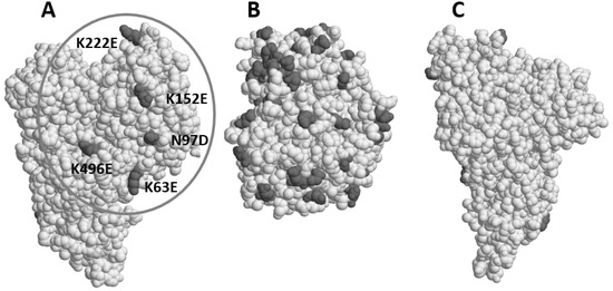 Mutations introduced by DNA shuffling were mapped on the Cry3Aa structure (Figure 5). It was found that most pKa−reducing (acidifying) mutations, such as Lys to Glu, were clustered on one side of the IP3 protein molecule (Figure 5, Panel A). There was no such mutation on the opposite side (Panel C). Since the coordinates of the first 60 amino acid residues are not available in the Cry3Aa X-ray structure, the orientation of MBP fused to the N-terminus of IP3 remains uncertain. However, it seems that MBP is on the side of IP3-1 shown in Panel A. This assumption is based on a deduced structure of this part of the protein from the Cry2Aa structure [15]. Those five mutations found in the surface area (Panel A, circled) which is presumably covered by MBP (Panel B) may assume MBP’s solubility enhancement role. Indeed, MBP has quite a few acidic or negatively charged, amino acid residues on its surface (Panel B). This suggests that the negative charges on a particular side of IP3 molecule as shown in Panel A is important for the high anti-WCRW activity.