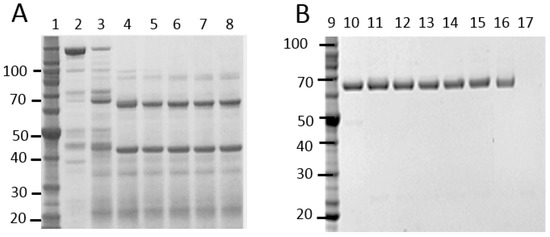 Digestion of MBP-IP3-7 (Panel A) and MBP-free, trypsin-digested, Superdex-purified IP3-7 (Panel B) with WCRW midgut digestive fluid. Approx. 0.5 mg/mL of IP3-7 proteins were exposed to the gut fluid, and the digestion was observed by SDS-PAGE. In Panel A, Lane 2 was MBP-IP3-7 not exposed to the gut fluid. Lanes 3–8 were MBP-IP3-7 digested with the gut fluid for 0 min (Lane 3), 15 min (Lane 4), 30 min (Lane 5), 1 h (Lane 6), 2 h (Lane 7) and 4 h (Lane 8). In Panel B, Lane 10 was MBP-free IP3-7 not exposed to the gut fluid. Lanes 11–16 were MBP-free IP3-7 incubated with the gut fluid for 0 min (Lane 11), 15 min (Lane 12), 30 min (Lane 13), 1 h (Lane 14), 3 h (Lane 15) and 16 h (Lane 16). Lane 17 was the gut fluid only. Lanes 1 and 9 were BenchMark™ Protein Ladder (Life Technologies, Carlsbad, CA, USA) with approx. molecular weights in kDa.