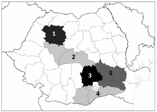 The five Romanian regions included in the study, belonging to different climatic areas: 1. North-West (n = 9), 2. Mideast (n = 9), 3. North Muntenia (n = 31), 4. South Muntenia (n = 37), 5. South-East (n = 16).