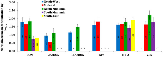 Normalized mean concentrations of mycotoxins in wheat across the five different Romanian regions. Mean concentrations were normalized by Log10 (1 + a) where a is the average concentration of the positive samples expressed in μg kg−1. When a mycotoxin was not detected in the wheat samples in a region, no normalized value was calculated and a short horizontal line (-) corresponding to that mycotoxin in that region was used.