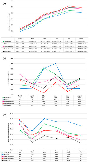 Evolution of (a) monthly mean temperatures; (b) monthly amount of rainfall; and (c) mean of relative humidity in Romania during 2015 (April–August) [37].