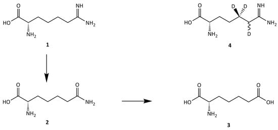Chemical structures of indospicine (1) and its metabolites 2-aminopimelamic acid (2) and 2-aminopimelic acid (3), together with D3-l-indospicine (4) which is used as an internal standard in LC-MS/MS analysis.