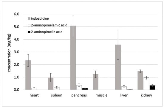 In accord with the previous analysis, the highest concentration of indospicine in necropsied camels (camels 1–3) was found, in this study, in the pancreas (5.06 ± 0.79 mg/kg FW), followed by the liver (3.57 ± 1.17 mg/kg FW), heart (2.32 ± 0.48 mg/kg FW), kidney (1.48 ± 0.11 mg/kg FW), muscle (1.24 ± 0.26 mg/kg FW), and spleen (0.96 ± 0.34 mg/kg FW) (Figure 2). However, if we look at the deamino metabolites, the highest concentration of the intermediate metabolite 2-aminopimelamic acid was found in the kidney (0.96 ± 0.12 mg/kg FW), followed by the pancreas (0.36 ± 0.11 mg/kg FW), liver (0.27 ± 0.06 mg/kg FW), spleen (0.20 ± 0.08 mg/kg FW), and heart (0.15 ± 0.02 mg/kg FW). Neither 2-aminopimelamic acid nor 2-aminopimelic acid could be detected in the muscle tissue. Only low concentrations of the second metabolite 2-aminopimelic acid could be found in kidney (0.34 ± 0.10 mg/kg FW), pancreas (0.11 ± 0.03 mg/kg FW), and liver (0.01 ± 0.02 mg/kg FW).
